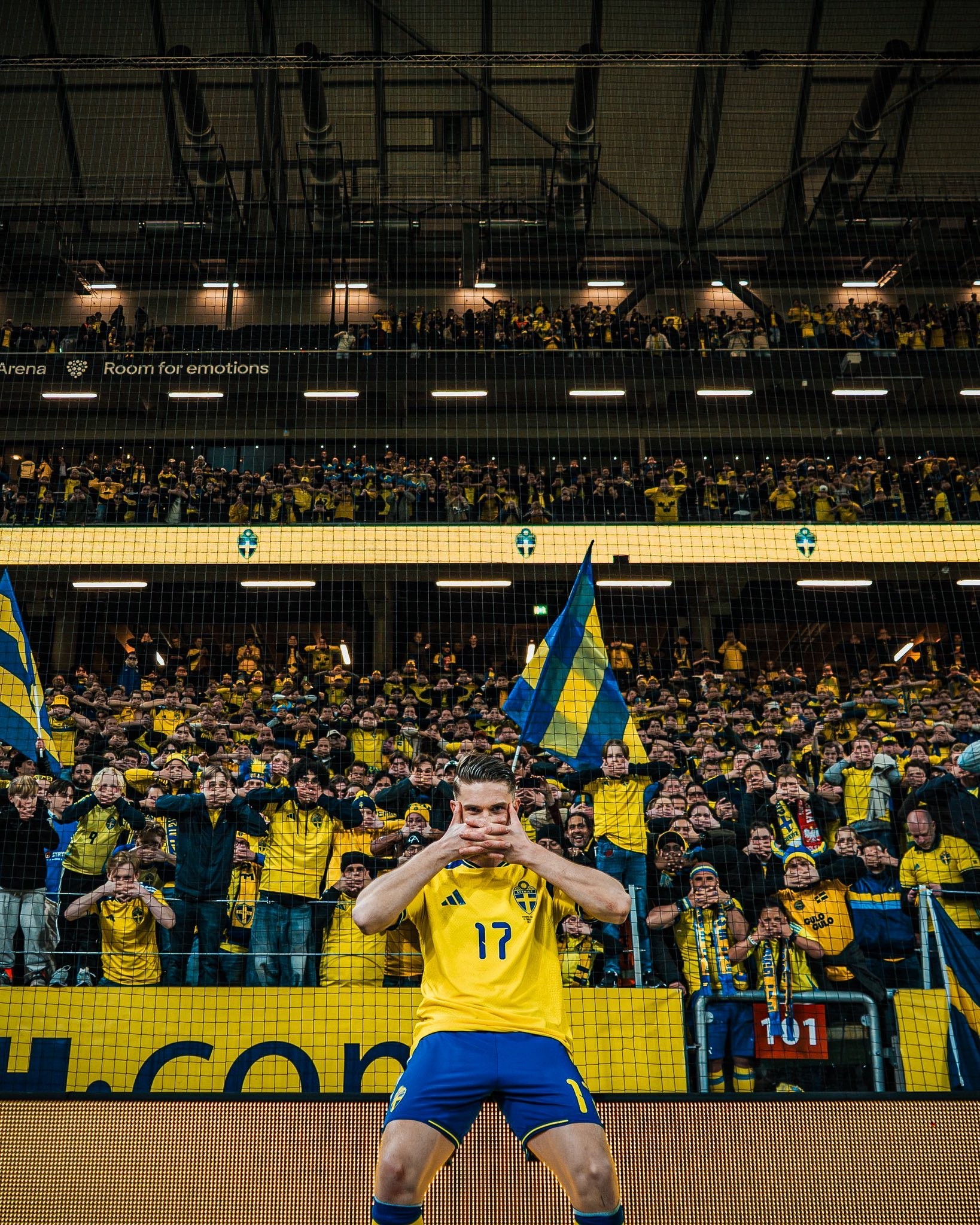 赛后,瑞典球迷们挥舞旗帜、欢呼雀跃,而哲凯的笑容也感染了全场,他邀请摄影师为他和球迷们一同拍照,而他们也集体做出了哲凯标志性的庆祝动作,这一张照片也定格了这次属于球迷与球员的共同荣耀瞬间。
